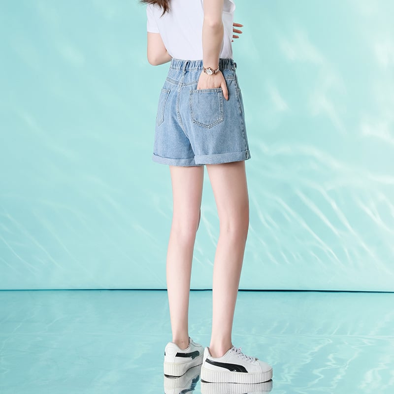Featuring a solid color design, they are versatile enough to match any outfit, making them a must-have addition to your summer wardrobe. The elastic waistband ensures a perfect fit, providing all-day comfort while maintaining a flattering silhouette. Whether you're heading out for a casual day with friends or dressing up for a summer evening, these denim shorts will keep you looking chic and feeling great.